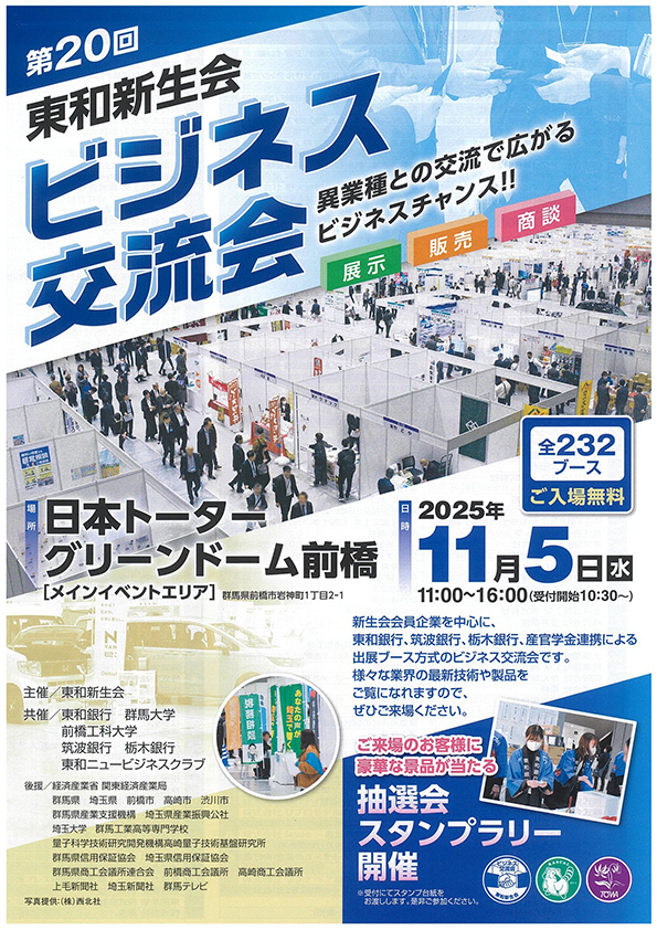 第20回 東和新生会「ビジネス交流会」に出展します日時:2025年11月5日(水) 11:00~16:00(来場者受付 10:30~)会場:日本トーターグリーンドーム前橋 群馬県前橋市岩神町1丁目2-1ブース番号:A-11